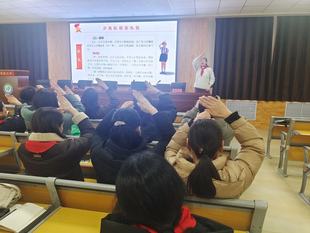 培训会上,杜娟娟老师紧密结合少先队工作实际,围绕深入学习贯彻习近平总书记重要贺信精神、落实第九次全国少代会工作部署进行理论宣讲,现场与辅导员们交流沟通基层问题,分享自身工作经历,结合案例剖析,深入讲解辅导员如何做好基层少先队工作。随后,杜老师聚焦少先队标志礼仪的基本规范,系统性地讲解了红领巾、队旗、队徽的正确使用与佩戴要求,并现场组织辅导员、学生示范了执旗、敬礼、呼号等标准礼仪动作。