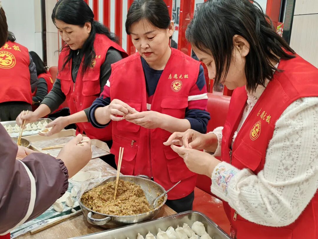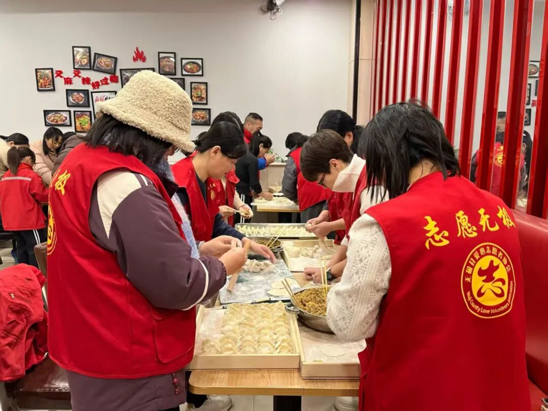 活动前夜8点,志愿者们已身着鲜红志愿马甲,在店内忙碌起来。和面、剁馅、调馅......每一道工序都饱含用心。桌上摆满馅料盆和饺子皮,志愿者们围桌协作,有的熟练包制,有的专注擀皮,"志愿无极"的红马甲成为冬日最温暖的色彩。