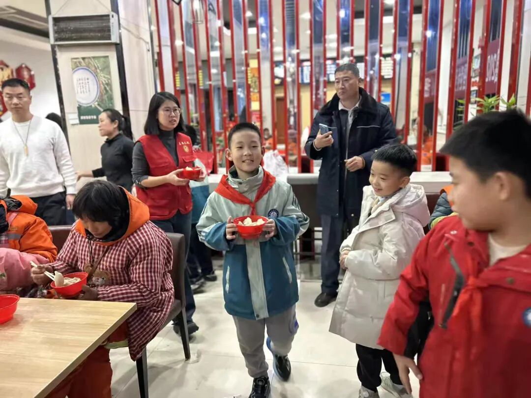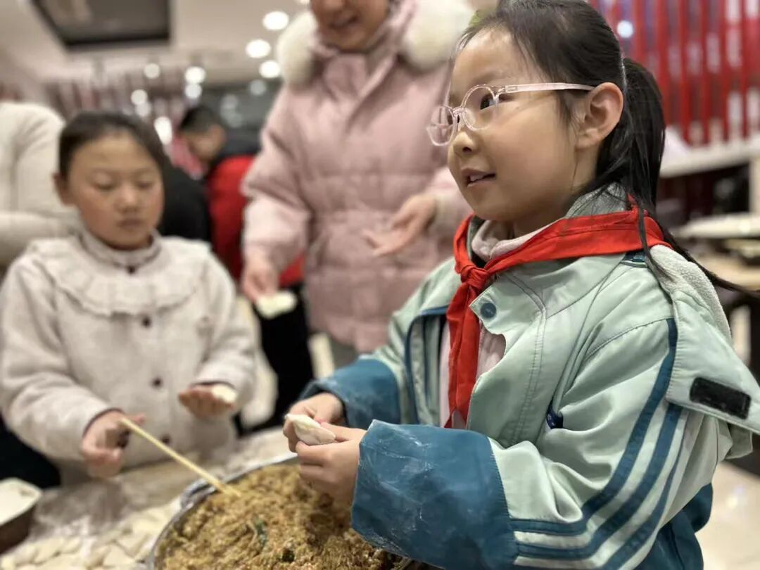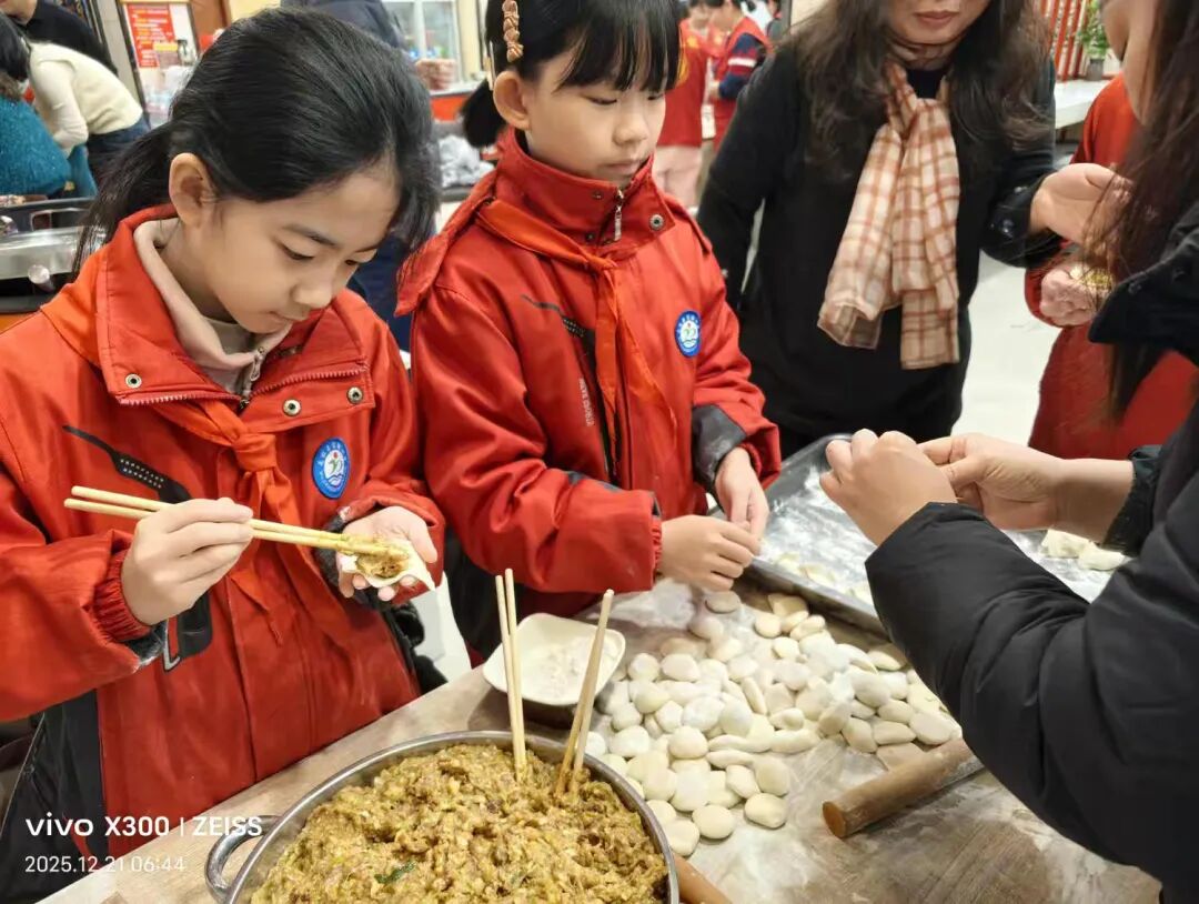 活动当天,无极县实验小学争做“饺饺者”的少先队员们成为最动人的风景线。系着红领巾的孩子们早早来到现场,在志愿者和长辈的指导下兴致勃勃地学习包饺子。小女孩认真夹馅的模样格外可爱;系红领巾的小男孩双手捧碗,笑容灿烂地将热饺端给环卫工人。这跨越年龄的温情互动,让"奉献、友爱"的种子在幼小心灵生根发芽。
