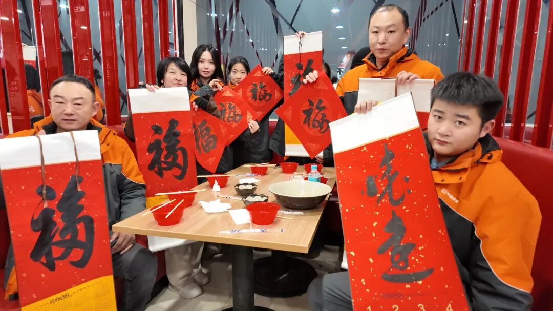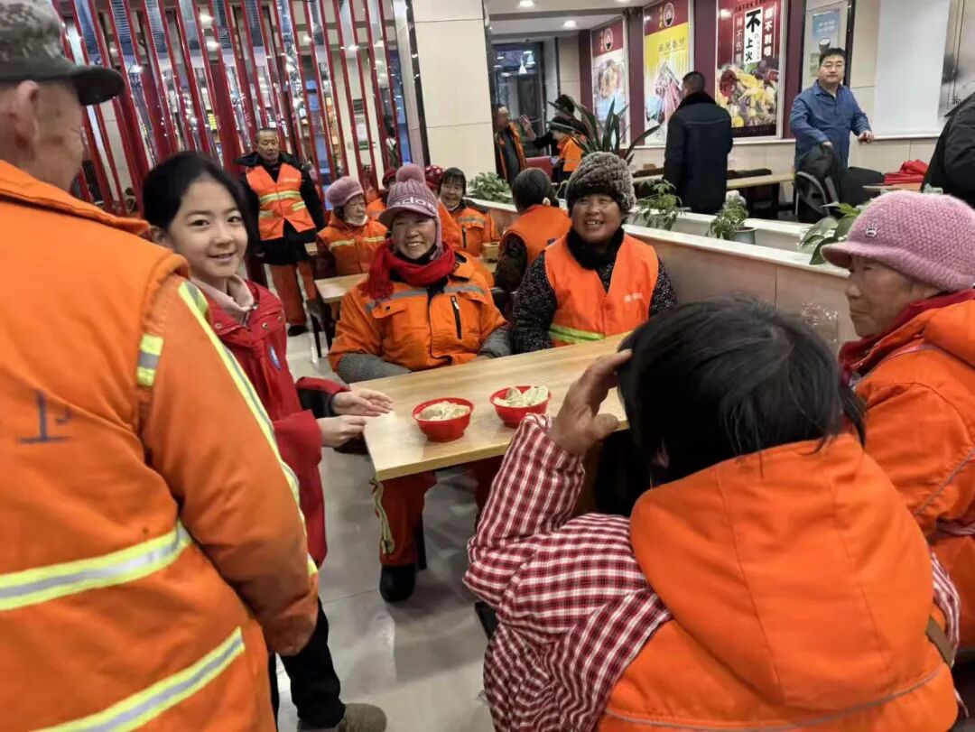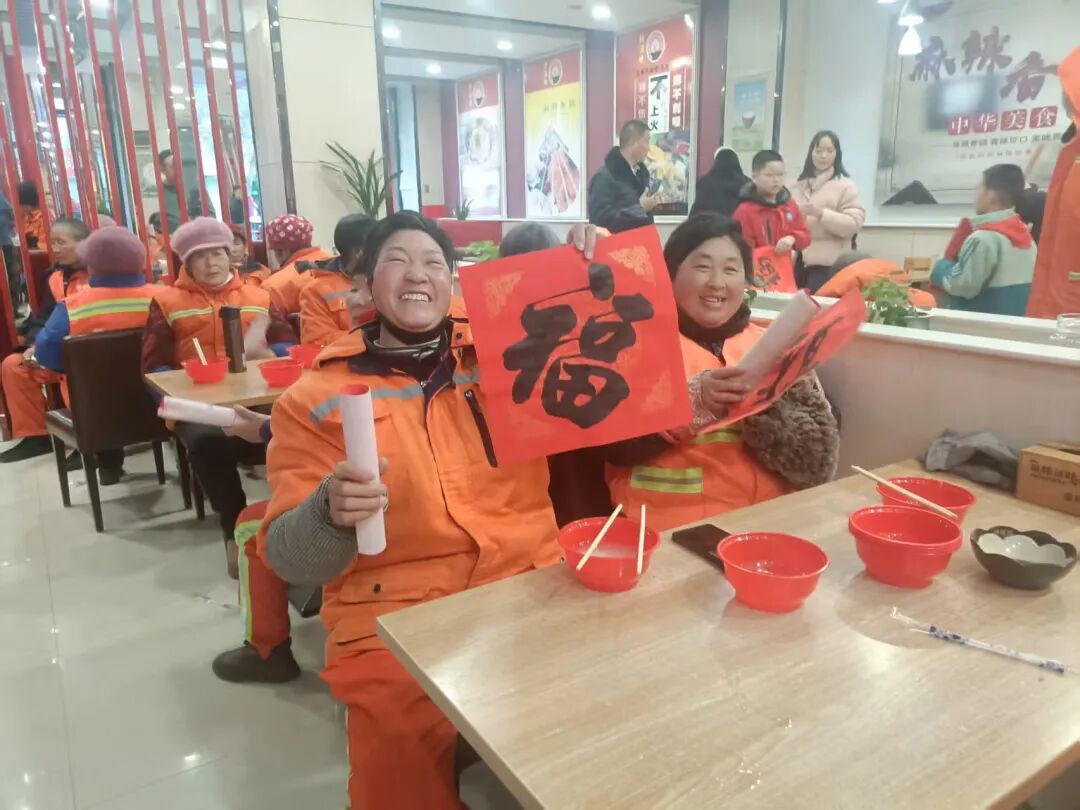 最温馨的画面莫过于快递小哥、环卫工人们围坐一堂品尝饺子的场景。他们身着橙色工作服,与桌上红碗交相辉映,脸上洋溢着幸福笑容。无极县美术馆赠送的福字和书法日历挂轴更添节日喜庆。两位环卫大姐手持大红"福"字,笑容比冬阳更暖。热气腾腾的饺子,配上墨香四溢的福字,让人们在品尝传统美食的同时,也提前感受到了浓浓的年味和深厚的文化祝福,暖胃更暖心。