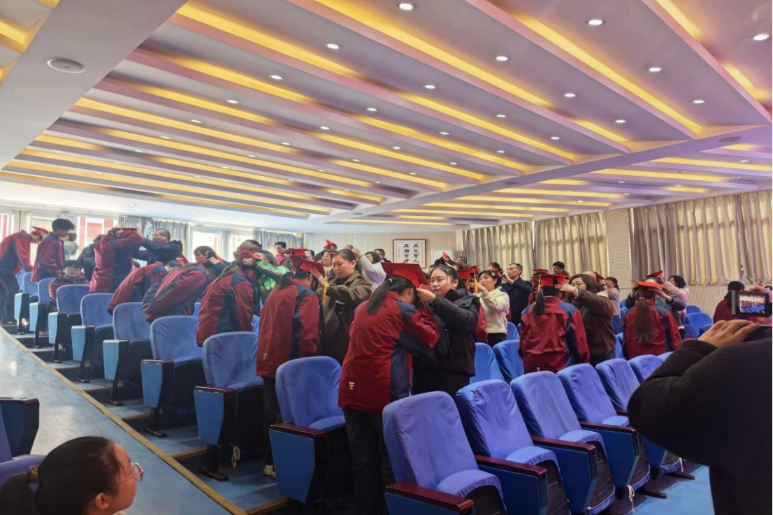 随后举行成人礼仪式,少先队员、团员代表朗诵《与祖国命运交响》;家长代表发言,传递长辈的殷殷嘱托;进行加冠仪式,家长为学生佩戴成人礼帽、整理衣冠;学生代表向全体成人学子发出青春倡议;校团支部书记带领全体学生进行宣誓,向世界宣告成人的决心。