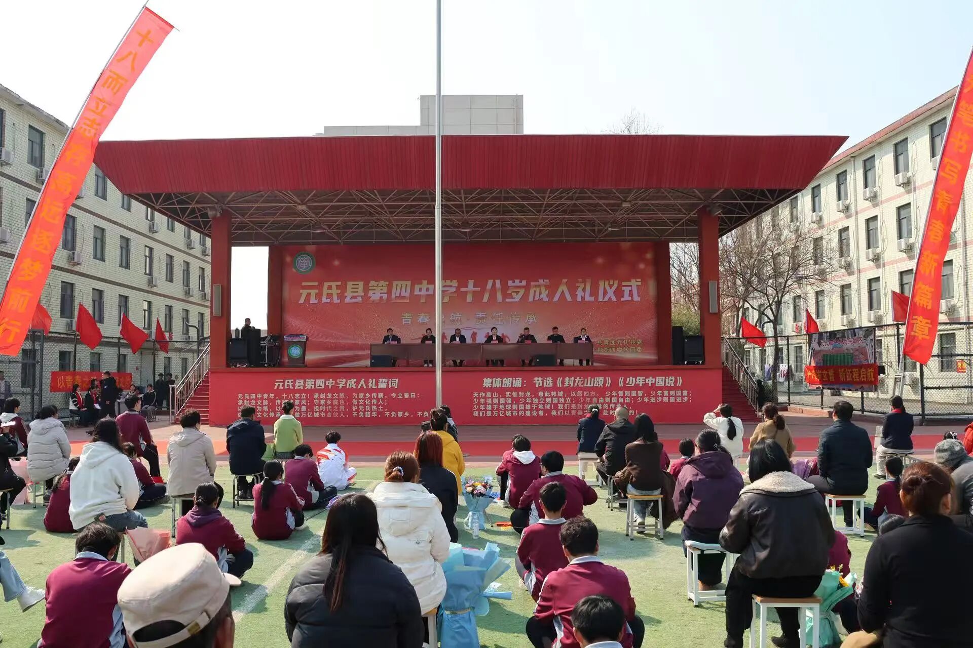 仪式在庄严的国歌声中拉开帷幕,家长带领孩子依次跨过“封龙启智门”与“文脉济世门”,教师手持鲜花夹道欢迎,青春旋律激昂奋进,象征着学子告别懵懂、迈入成年、开启人生新征程。教师朗诵《元氏风华·成人礼颂》,舞蹈生演绎《少年中国说》,全体学子齐诵《封龙山颂》《少年中国说》节选,文艺节目与经典诵读交相辉映,展现青年风采,厚植家国情怀与文化自信。