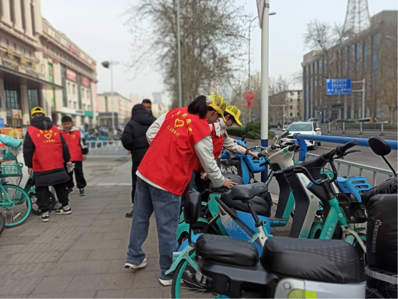 上午10时,分布在城区主干道沿线的七个服务点同时启动。在火车站东广场,小志愿者们提着水桶、拿着抹布.....,仔细擦拭着共享单车的车把、车筐和车座,清理车筐内废纸垃圾等物,并将随意停放的车辆一一归位,排列成行;在北国商城商圈和勒泰中心附近,身穿红马甲的“公益少年”们不仅清理了车身小广告,还向过往市民宣传文明停车理念,引导大家共同维护市容秩序。
